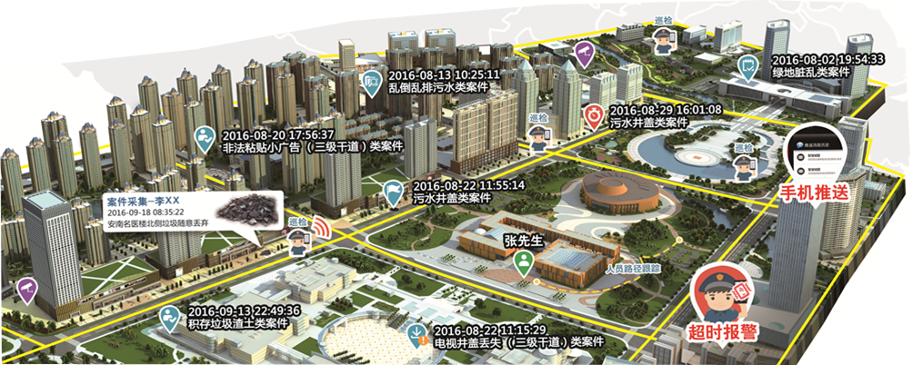 智慧城管管控平臺(tái)依托統(tǒng)一的三維地理信息平臺(tái),基于“43221”理論,結(jié)合城市管理部門(mén)業(yè)務(wù),將管理單元按照一定的標(biāo)準(zhǔn)劃分成為單元網(wǎng)格。安排網(wǎng)格監(jiān)督員對(duì)單元網(wǎng)格的部件和事件巡查,建立一種監(jiān)督和處置互相分離的形式。主要優(yōu)勢(shì)是能夠主動(dòng)發(fā)現(xiàn)并及時(shí)處理各類(lèi)問(wèn)題,加強(qiáng)管理能力和處理速度,將問(wèn)題解決在事故發(fā)生之前。