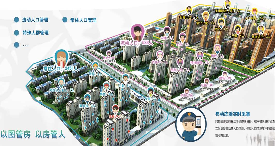 人口信息管理系統通過在社區、街道安排網絡監管員,以公安人口信息為核心,以公民身份證號碼為唯一代碼,進入人口基礎信息的實時采集和更新,內容包括住址、政治面貌、家庭成員、不良行為、工作變更記錄、教育經歷、人員流動記錄、社會貢獻等39大類200多個小項信息。同時,將城市中的房產和人口信息相關聯,通過不動的房產對流動的人口在地里信息系統上進行定位及管理,實現“以房管人”,實現對城市中的常住人口、流動人口、以及特殊人員的管理,可以服務于社會治安管理部門、衛生與計劃生育部門、教育部門、住建部門、房產部門、黨組織等多個部門。■ 綜合查詢:可以查詢并分析各類人口的分布密度和分布規律,對特殊人群、孤寡老人、育齡婦女等進行準確的跟蹤監督,提升社會治安管理水平,實現優撫、低保、救災、教育、流動黨員等信息的精準管理。達到以圖管人,以房管人。